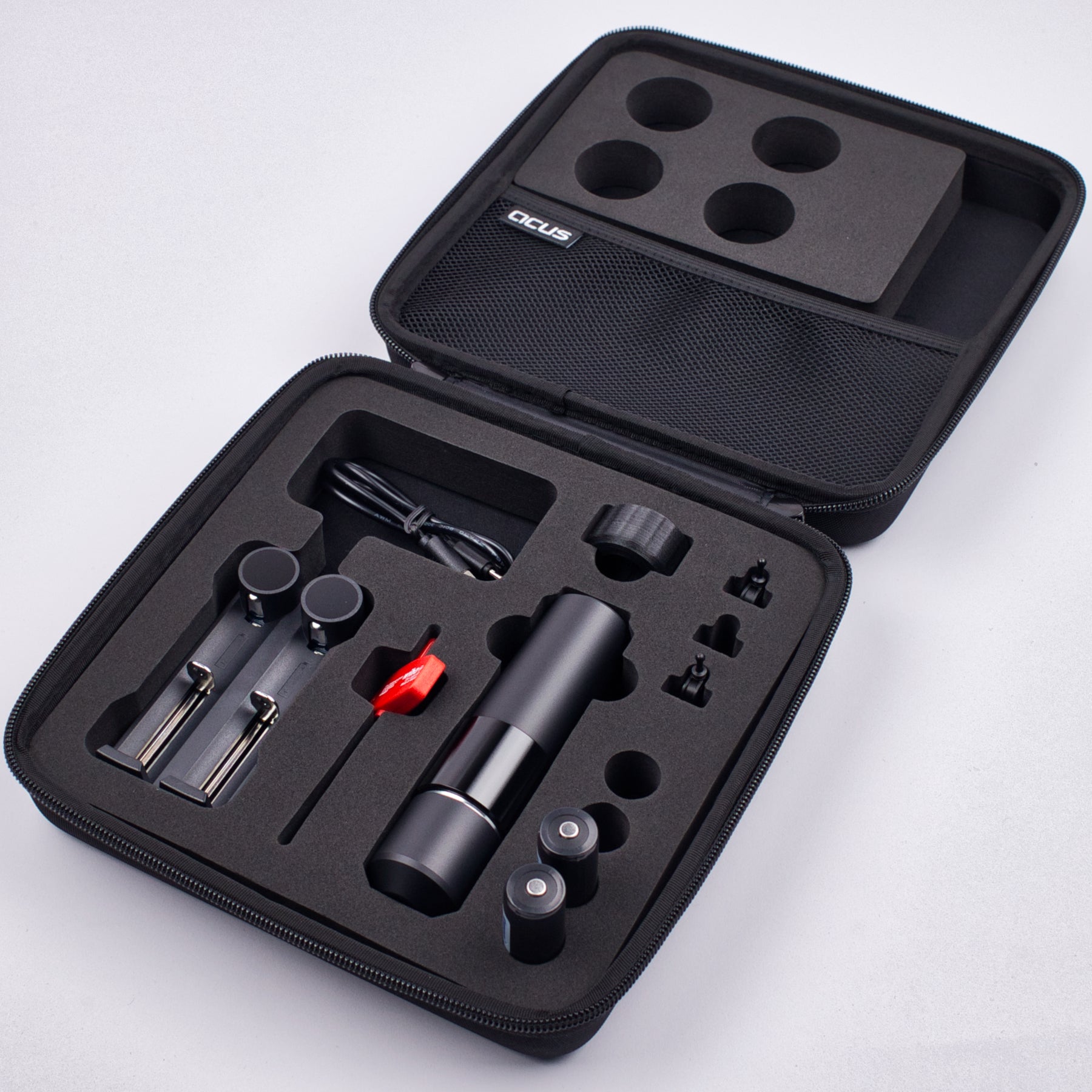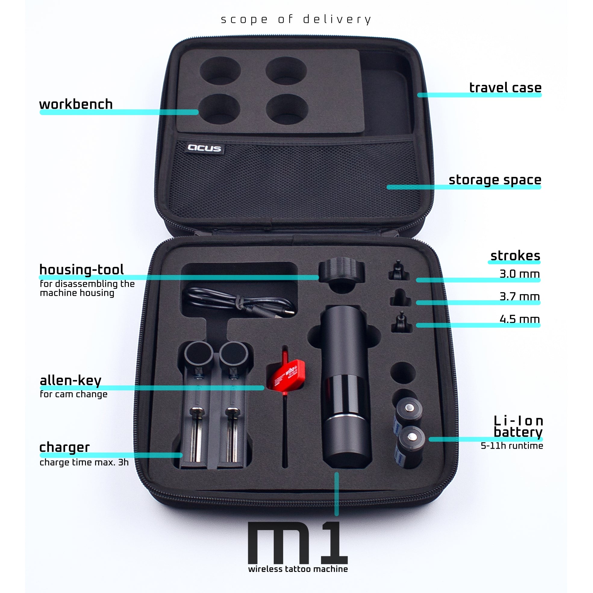 The M1 comes in a practical travel case, equipped with 2 batteries and matching charger, 3 drive heads, tools, instruction manual and a few spare O-rings.